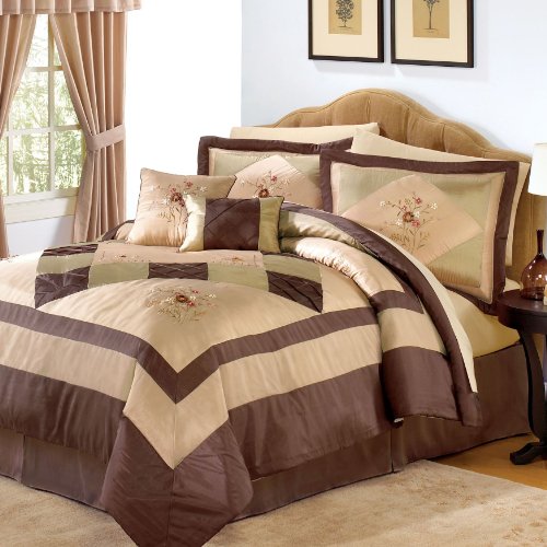 Multi Pieced Bedding Sets With Embroidery Details. Beautifully handcrafted comforter set, rendered in pieced design, are accented with a charming flourish of embroidery trim. Dramatic handcrafted, pieced design makes a bold statement with raised ribbon embroidery and modern geometric style. Brushed peachskin finish. Includes 1 oversized comforter, 1 bedskirt, 2 standard shams, square toss pillow (16"x16") and breakfast pillow (12"x16"). Polyester. Machine wash. Imported. Full. Queen. King.
