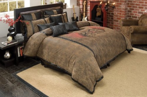 Live the rock and roll dream with nail head details with blazing guitars in the center of this rock star bedding on a faux leather camel and black setting with faux leather striping. Color: Camel with Faux Leather Details. One - Queen size comforter measuring 94 inches x 96 inches. One - Queen size bedskirt measuring 60 inches x 80 inches with a 14 inch drop. Two - Standard pillow shams measuring 30 inches x 26 inches.